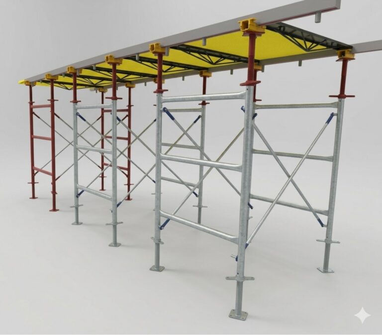 Estructura temporal, fija o móvil, diseñada para soportar grandes cargas durante procesos constructivos exigentes como puentes, losas elevadas y placas a gran altura.